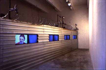 The piece was made up of a wall, topped with razor-wire, with multiple embedded screens in its face. Four robotic cameras were mounted on the wall, each with a secondary tracking camera. My software located heads within the images of the tracking cameras and directed the robotic cameras to follow heads as precisely as possible. The robotic cameras were very fast, and had very long imposing lenses on them. Spookily, as the camera followed you , you were always looking directly down the "barrel" of the lens.