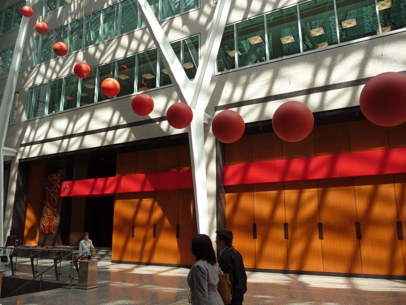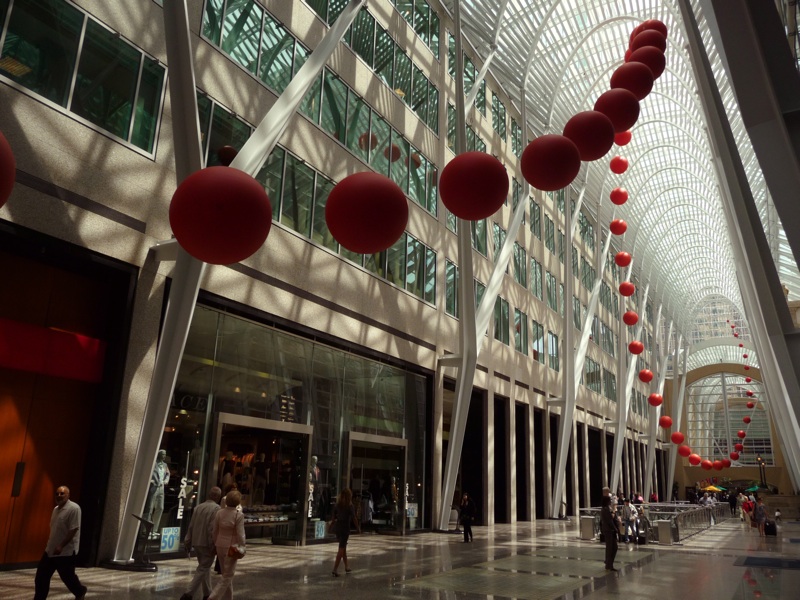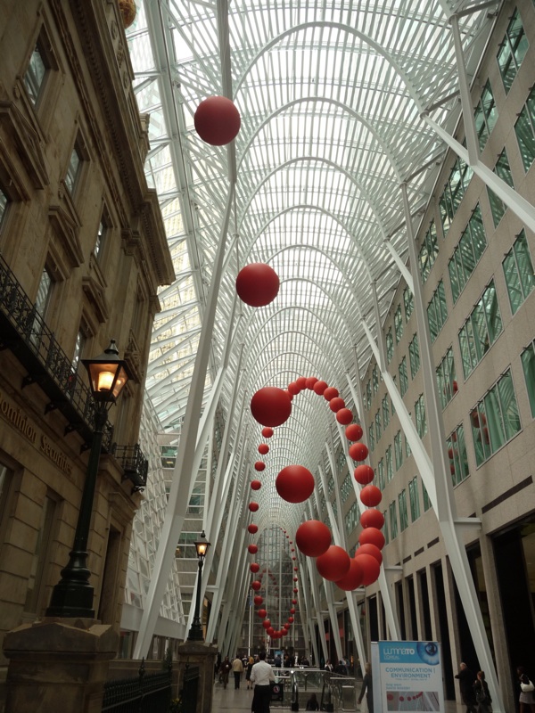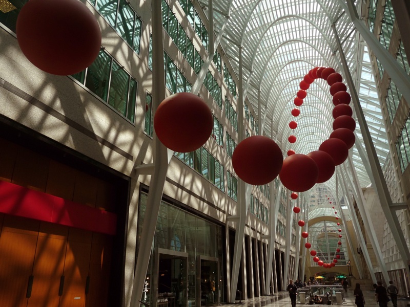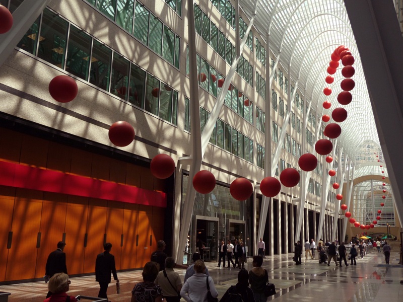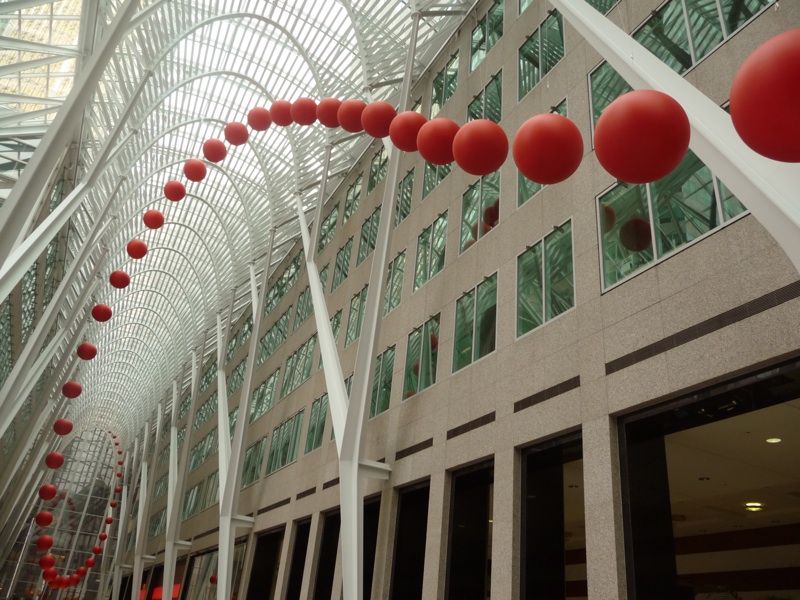 Long wave is a site specific installation that was commissioned by Luminato, Toronto Festival of Arts + Creativity and was on view at the Allen Lambert Galleria, Brookfield Place, Toronto, June 5 - 20, 2009. It is a 380 foot long, 60 foot high sculpture tracing a helix through the entire length of the galleria. The helix is constructed from 63 large red spheres hanging from the Santiago Calatrava designed arches of the galleria, rising from just above visitors' heads right up to the vaults of the ceiling.