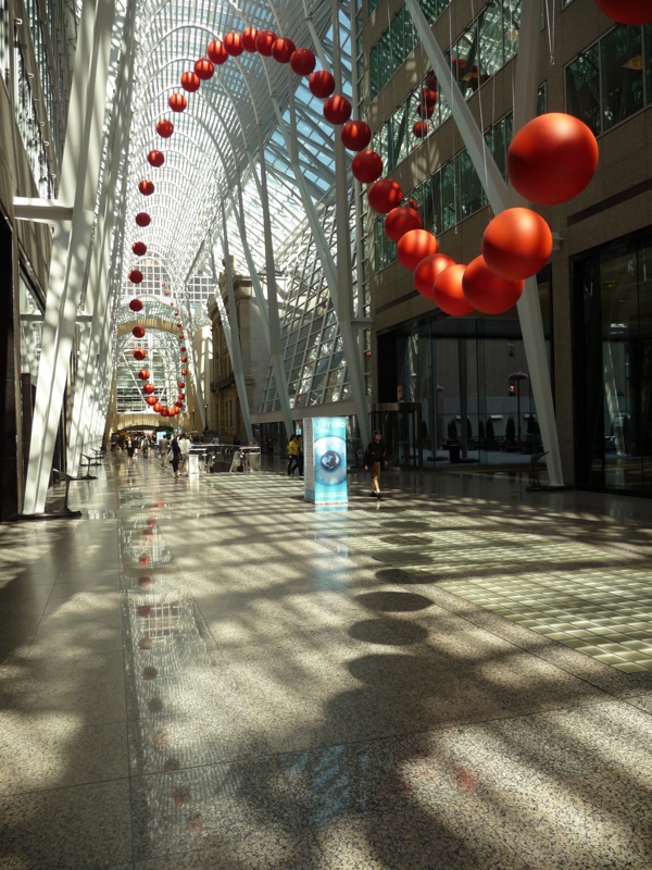 The sculpture is static, but it is designed to appear to transform its shape as you move through the galleria. It plays with the architecture, honouring and at the same time toying with and destabilizing the formal regularity of the soaring, cathedral-like space.