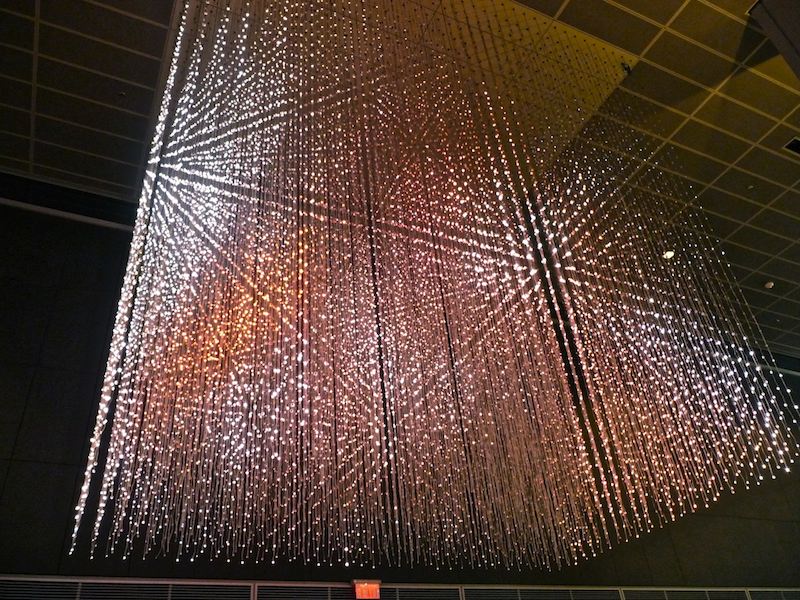 Pixel cube is a 12 x 15 x 18 foot cube made up of 30,000 individually controllable colour LED's suspended in the foyer of 25 York Street. The pixels create a three dimensional image surface that can update at full video speed. A number of different approaches are used to present abstract and real-world imagery on and in the cube. The cube can present material prepared in advance, but it can also be live, and interactive.