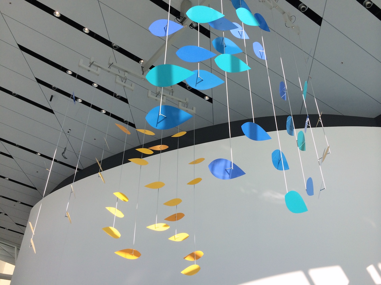 Schooling transforms the lobby space of Ripley's Aquarium in Toronto into a huge aquarium tank, with fish soaring over the heads of its visitors. The artists use the structure of a conventional mobile animated by a cascade of 62 motors to represent the complex, unpredictable movement of fish as they group and scatter.